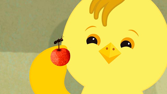 Los pollitos van con Lola a buscar frutas, mantequilla y café. En las frutas salen hormigas y una se sube en la cabeza de Pepe, él se sacude y se sacude. La hormiga va a parar a la mano de Juli, luego cae sobre Tino y después donde Coco.