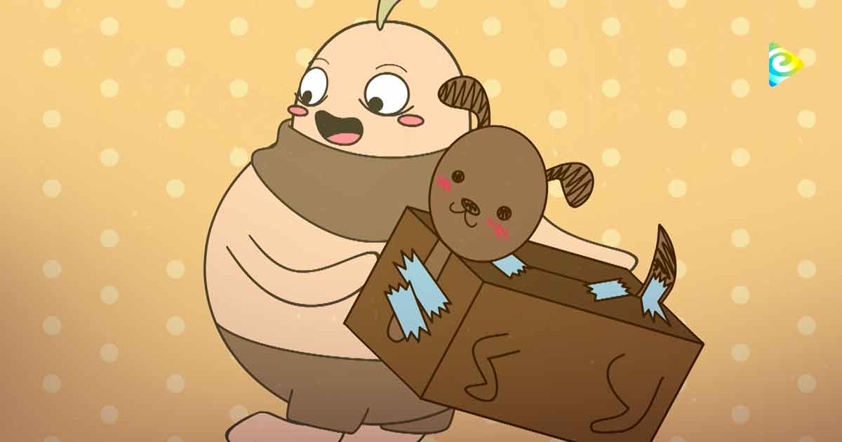 dibujo de una cebollita animada con un peluche de perrito