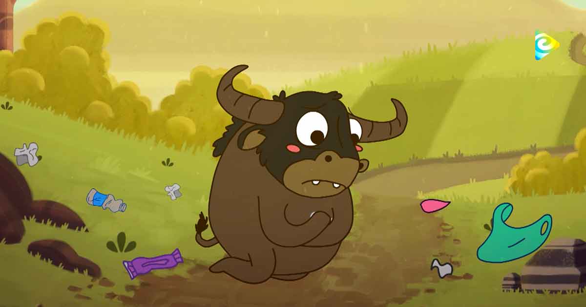 toro animado rodeado de basura