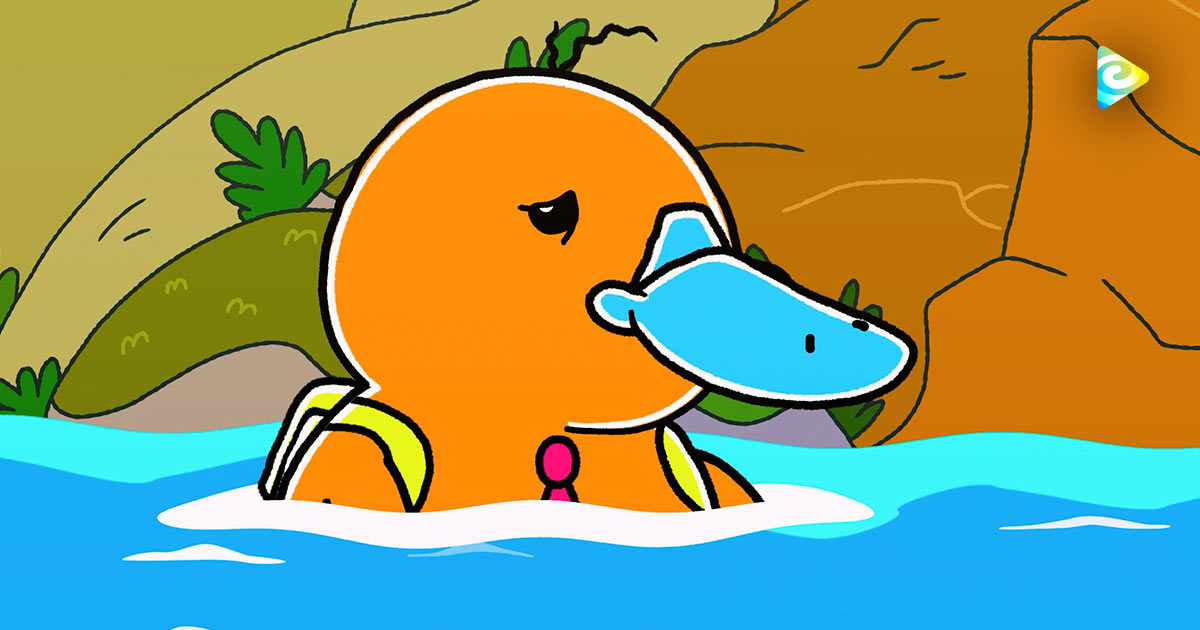 Ornitorrinco animado en un río, hola flinko en rtvcplay, animales latinos, viajar en globo