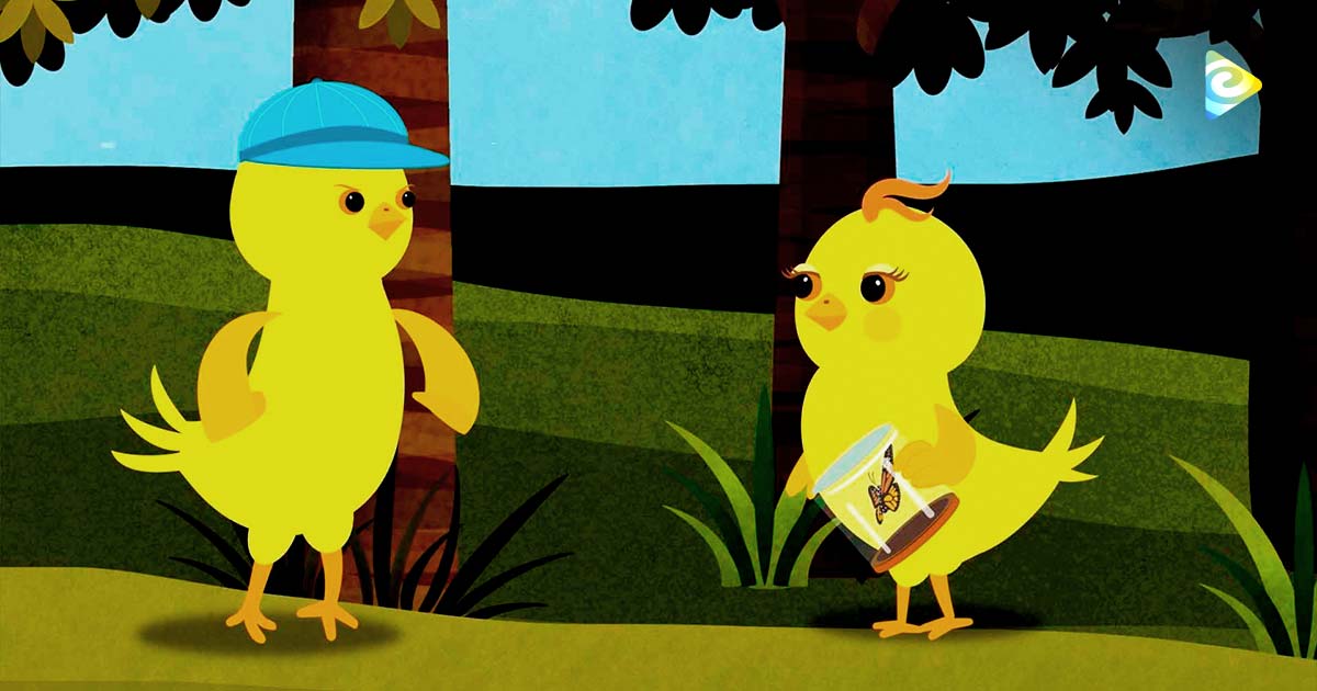 Los pollitos muy atentos, observan las crisálidas esperando que nazcan las mariposas. A la mañana siguiente, las mariposas empiezan a salir de sus capullos, Juli atrapa una de ellas para dibujarla en papel, mientras todos los pollitos empiezan a cantar.