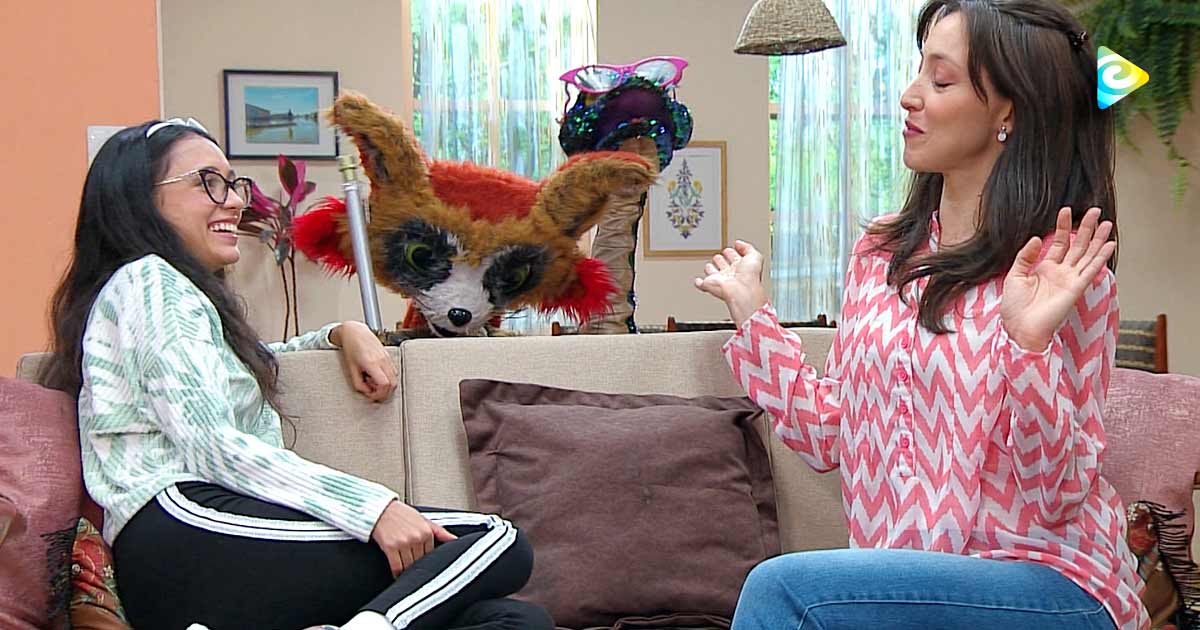 niña, mujer y títeres riéndose