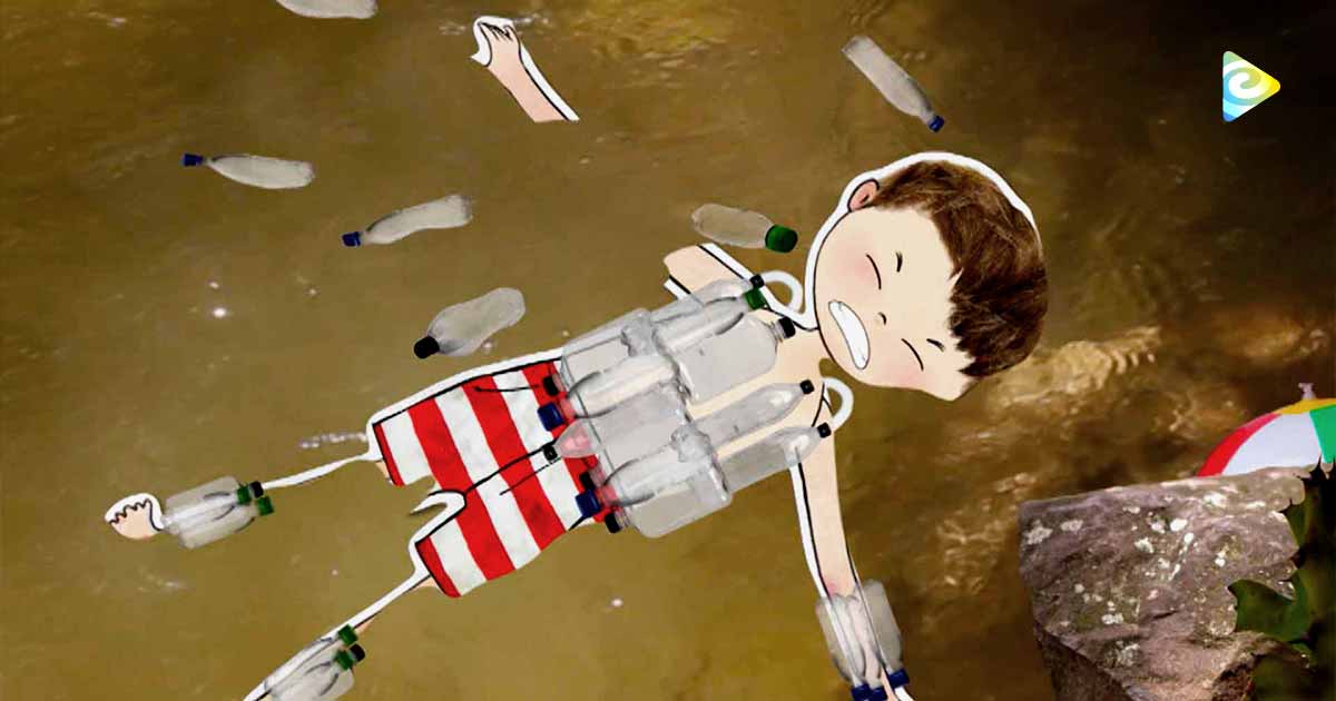 niño flotando en el río con flotador hecho de botellas