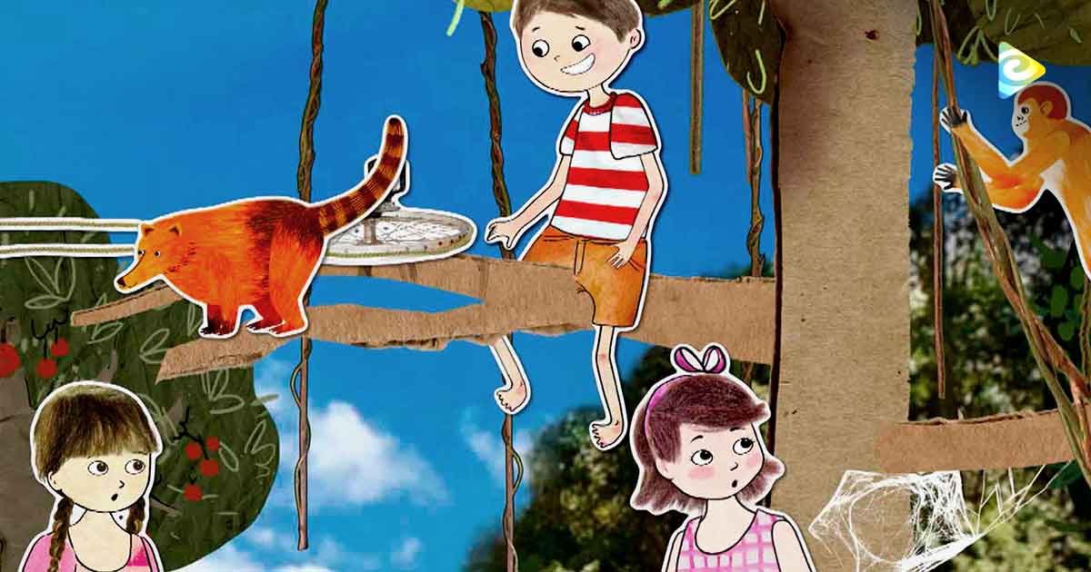 Junto a la carretera en un corredor de árboles frutales a los pies de la montaña, Édison van y Tomás recogen mangos. Édison jala el mango con una vara larga, mientras y Tomás con un cesto los atrapa. ¿Un juego peligroso?