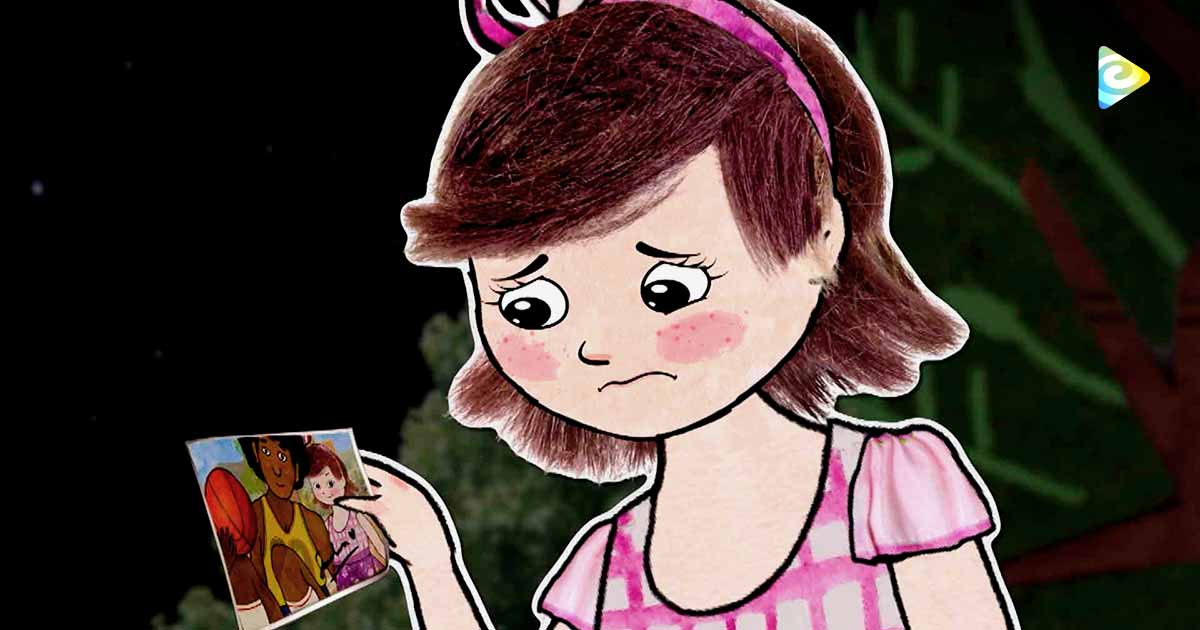 Alba sostiene una foto de su balón preferido, mientras Tomás inventa una máquina para repararlo