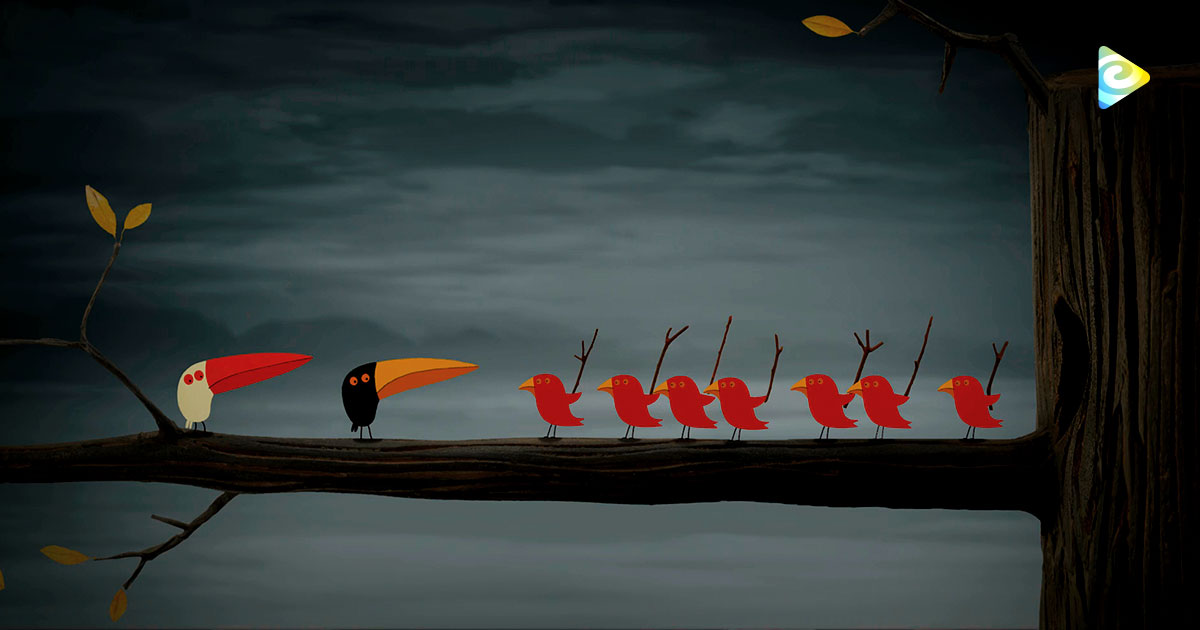 Los dos pajaritos descansan hasta que algo llama su atención, muchos pájaros rojos entran alegres a un hueco en la copa del árbol. Los dos pajaritos intentan entrar, pero son rechazados, entonces se pintan de rojo para poder ser aceptados.